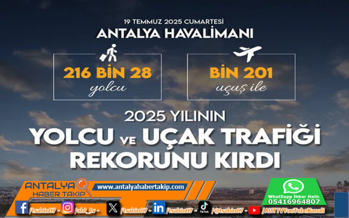 antalyahabertakip.com - Yapılan açıklamaya göre, 19 Temmuz’da toplam 1.201 uçak iniş-kalkış yaparken, 216.028 yolcuya hizmet verildi. Bu rakamlarla, 2025 yılının şu ana kadarki günlük yolcu ve uçak trafiği rekoru kırılmış oldu.