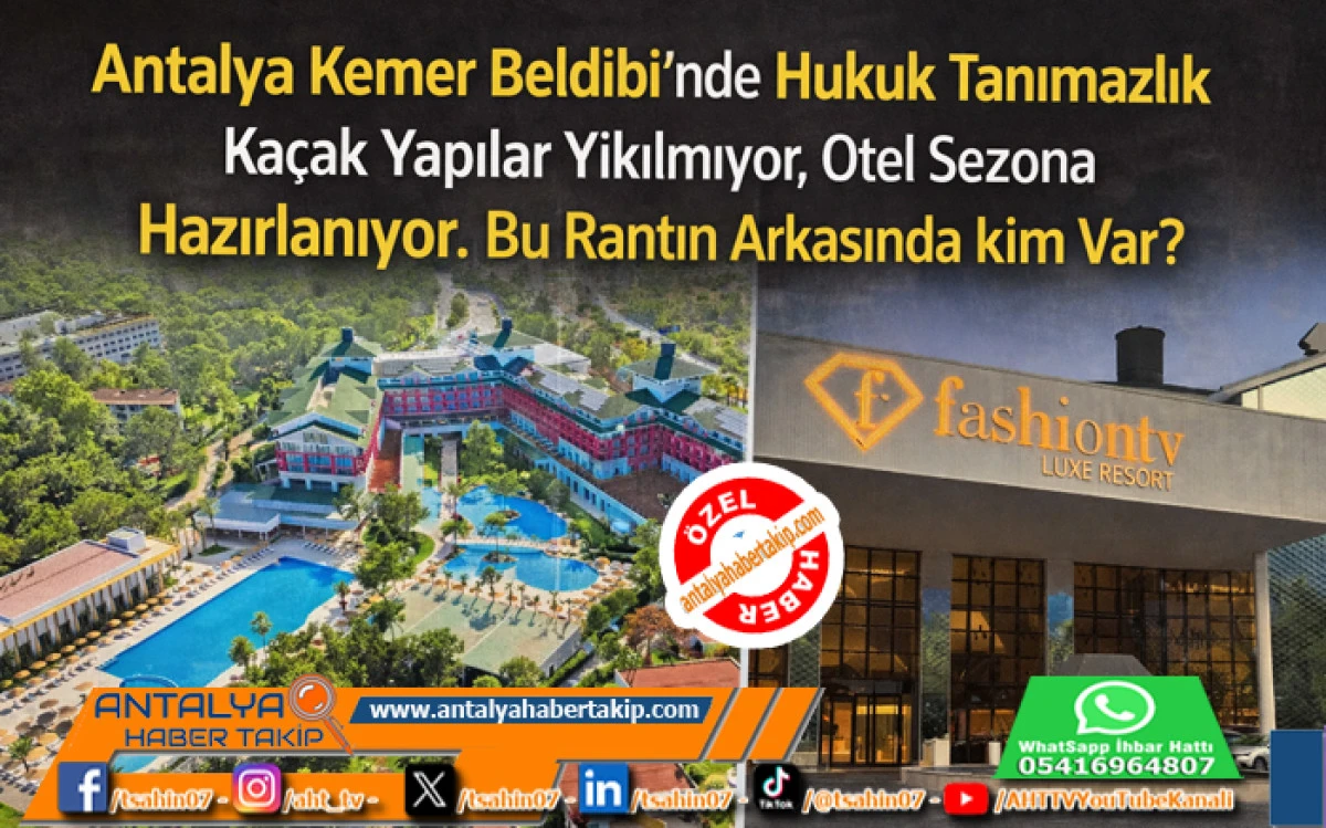 Antalya’nın Kemer ilçesine bağlı Beldibi Mahallesi’nde bulunan Kemer FashionTV Luxe Resort Hotel’le ilgili gündeme gelen kaçak yapılara kimse herhangi bir işlem yapılmıyor.