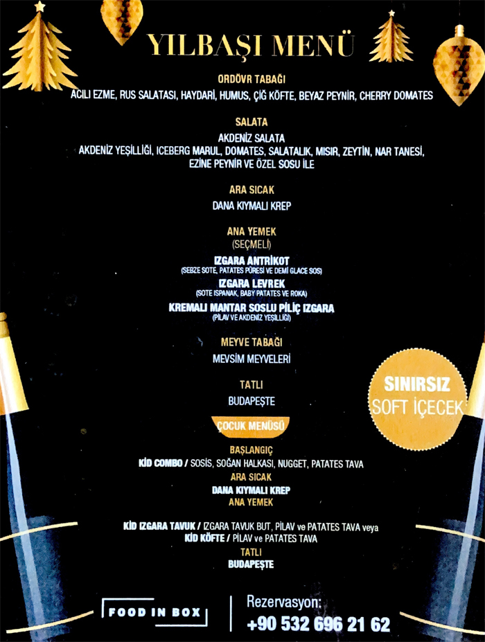 Yeni yılla birlikte menüsünü güncelleyen FOOD in BOX, yeni yıl menüsüyle Antalyalılara hizmet vermeye devam ediyor. Özenle hazırlanan yeni lezzetler, modern sunumlarla buluşturularak misafirlerin beğenisine sunuluyor. Gerek arkadaş buluşmaları gerek aile yemekleri gerekse özel günler için tercih edilen FOOD in BOX, her ziyarette aynı kaliteyi ve samimiyeti sunmayı sürdürüyor.