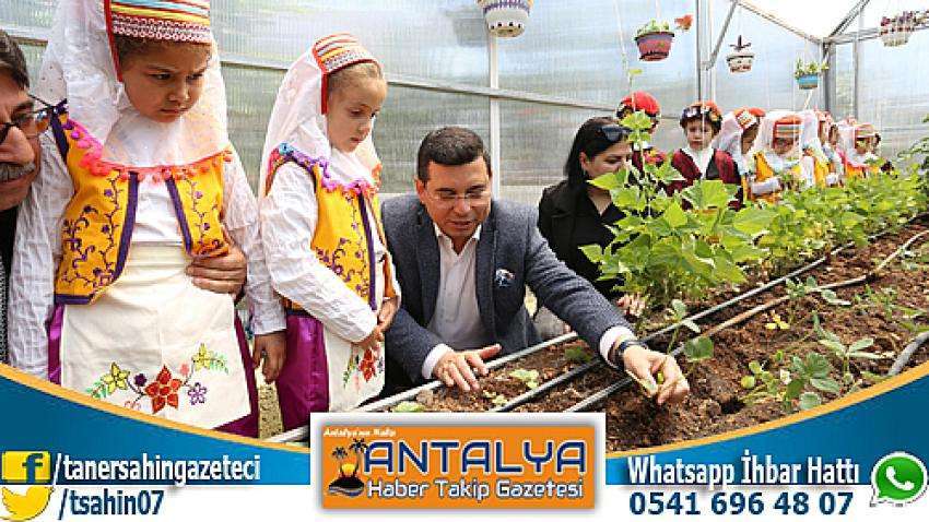 Emine Fatma Çevik Anaokulu bahçesine kurulan seranın açılışına katılan Kepez Belediye Başkanı Hakan Tütüncü, minik öğrencilerle çilek ekti.
