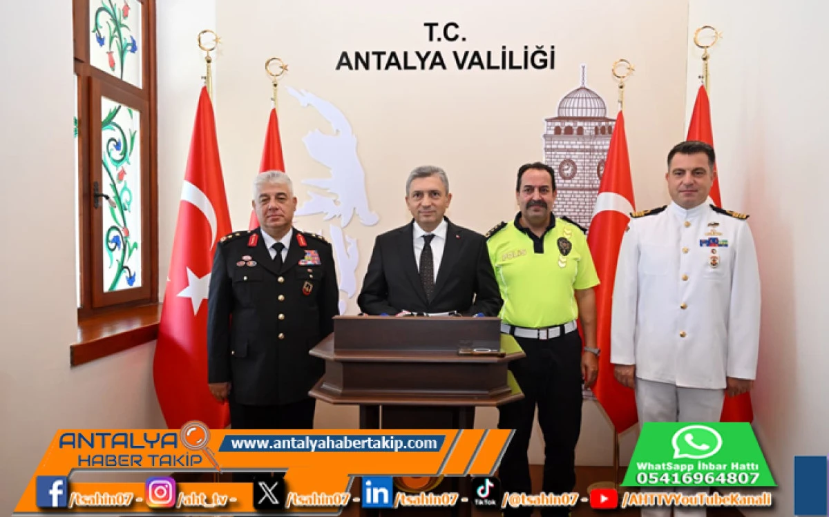Antalya Valiliği Hükümet Konağında gerçekleştirilen Basın Bilgilendirme Toplantısı’nda, Antalya Valisi Hulusi Şahin’e, İl Jandarma Komutanı Tümgeneral Ahmet Kavukcu, İl Emniyet Müdürü İlker Arslan ve Sahil Güvenlik Grup Komutanı Yarbay Tolga Coşkun eşlik etti.